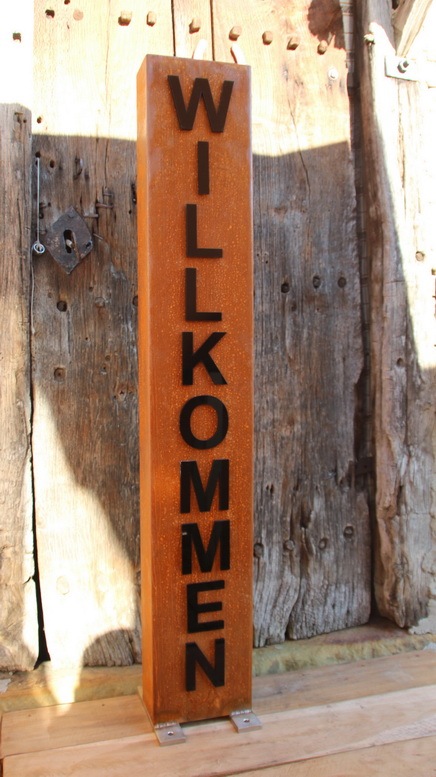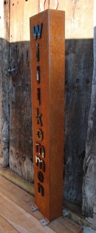 Cortenstahl Cor-ten Stahl Schilder/Stelen mit einzelnen Acrylglas Ziffern beschriftet.