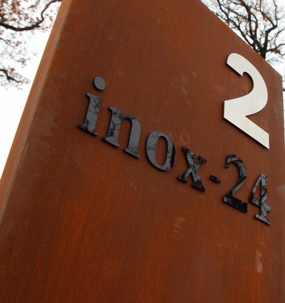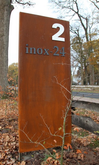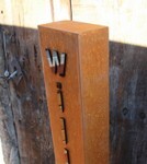 Cortenstahl Cor-ten Stahl Schilder/Stelen mit einzelnen Acrylglas Ziffern beschriftet.